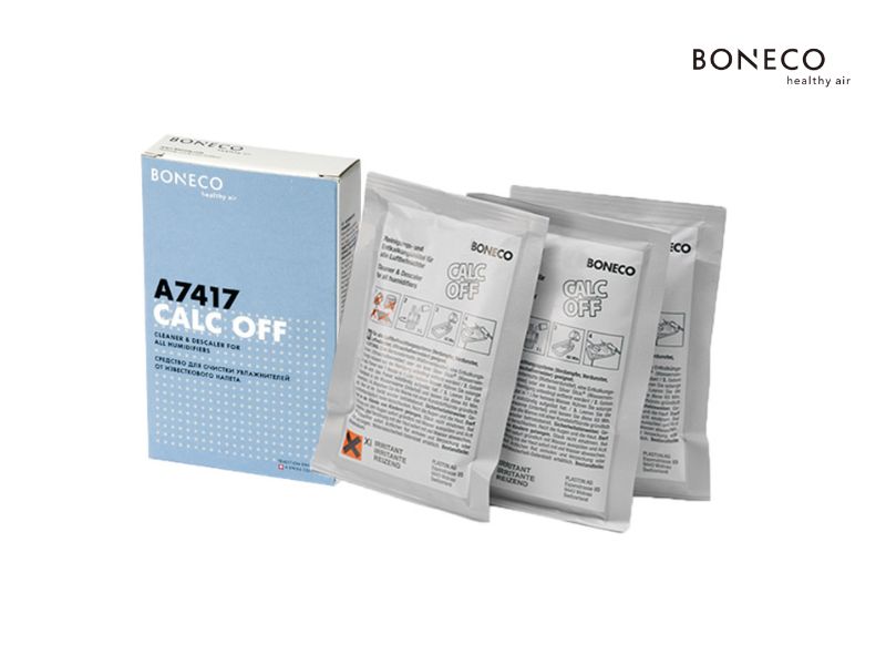 Để giải quyết vấn đề này, BONECO đã phát triển CalcOff - dung dịch tẩy cặn dạng bột chuyên dụng dành cho tất cả các dòng máy tạo ẩm của hãng. CalcOff có khả năng làm sạch cặn vôi nhanh và an toàn, đồng thời thân thiện với môi trường và dễ dàng sử dụng tại nhà. BONECO khuyến nghị người dùng nên thực hiện tẩy cặn bằng CalcOff từ hai đến ba tuần một lần để đảm bảo thiết bị luôn được làm sạch sâu và duy trì hiệu suất tối ưu.